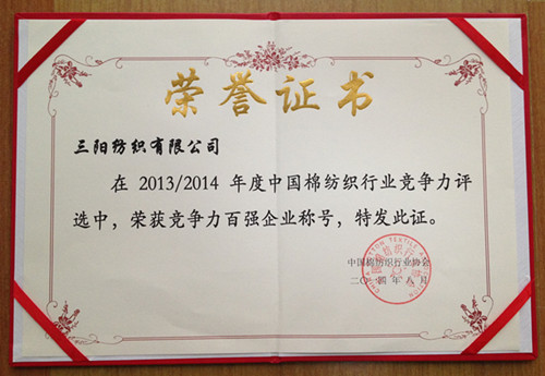 公司在2013—2014年度中国棉纺织行业竞争力评选中,荣获竞争力百强企业称号。