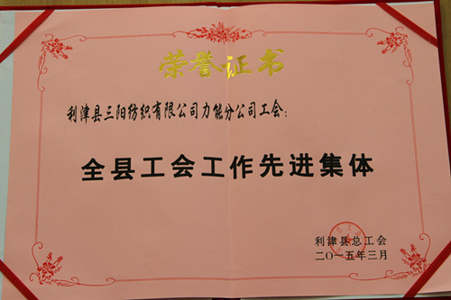 3月6日下午,县总工会九届三次全委(扩大)会议在县总工会一楼会议室举行。会上,对2014年度工会工作先进集体及个人进行了表彰。我公司工会申报的“创建和谐文化,实现全员管理”项目,荣获2014年度东营市工会工作创新奖三等奖;力能公司荣获全县工会工作先进集体、恒丰公司荣获全县工会女职工岗位建功先进集体、工会委员郭志强同志荣获全县优秀工会工作者、织造分公司织车工王树花荣获全县工会女职工岗位建功先进个人称号。