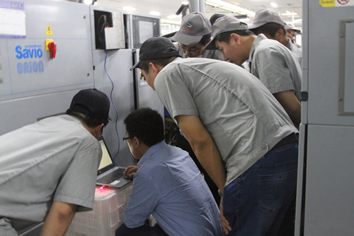 为提高各级管理人员的信息化意识。4月23日上午,公司策划部特邀乌斯特工程师辛红海来公司就络筒专家系统,对精纺公司四个车间的各级管理人员和工艺员进行培训。 为了加深各层基管理人员对信息化的了解,本次培训在精纺一车间络筒工序通过现场测试的方式进行。为了使培训达到预期的效果,根据现场测试情况在办公楼二楼会议室通过PPT以及现场提问的方式进行。 在培训过程中,通过现场的视觉冲击和培训现场的互动,使全体参训人员对系统有了更深的了解,同时加深了各级管理人员的信息化意识。