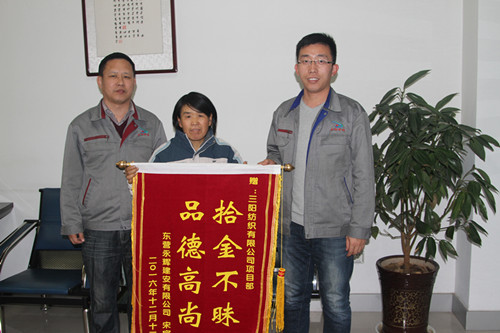 12月12日上午,宋玉华将一面印有“拾金不昧,品德高尚”的锦旗送到了公司项目部。郭永林同志拾金不昧的行为,充分体现了三阳员工高尚的道德情操和精神面貌,他用自己拾金不昧的实际行动展现了我们三阳人优秀的个人品质,为公司赢得了良好的声誉。