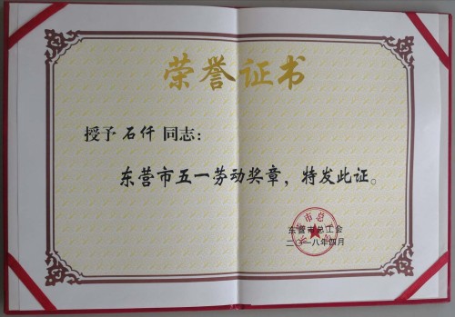 近日,我公司织造分公司浆纱挡车工石仟被东营市总工会授予 “东营市五一劳动奖章”荣誉称号。