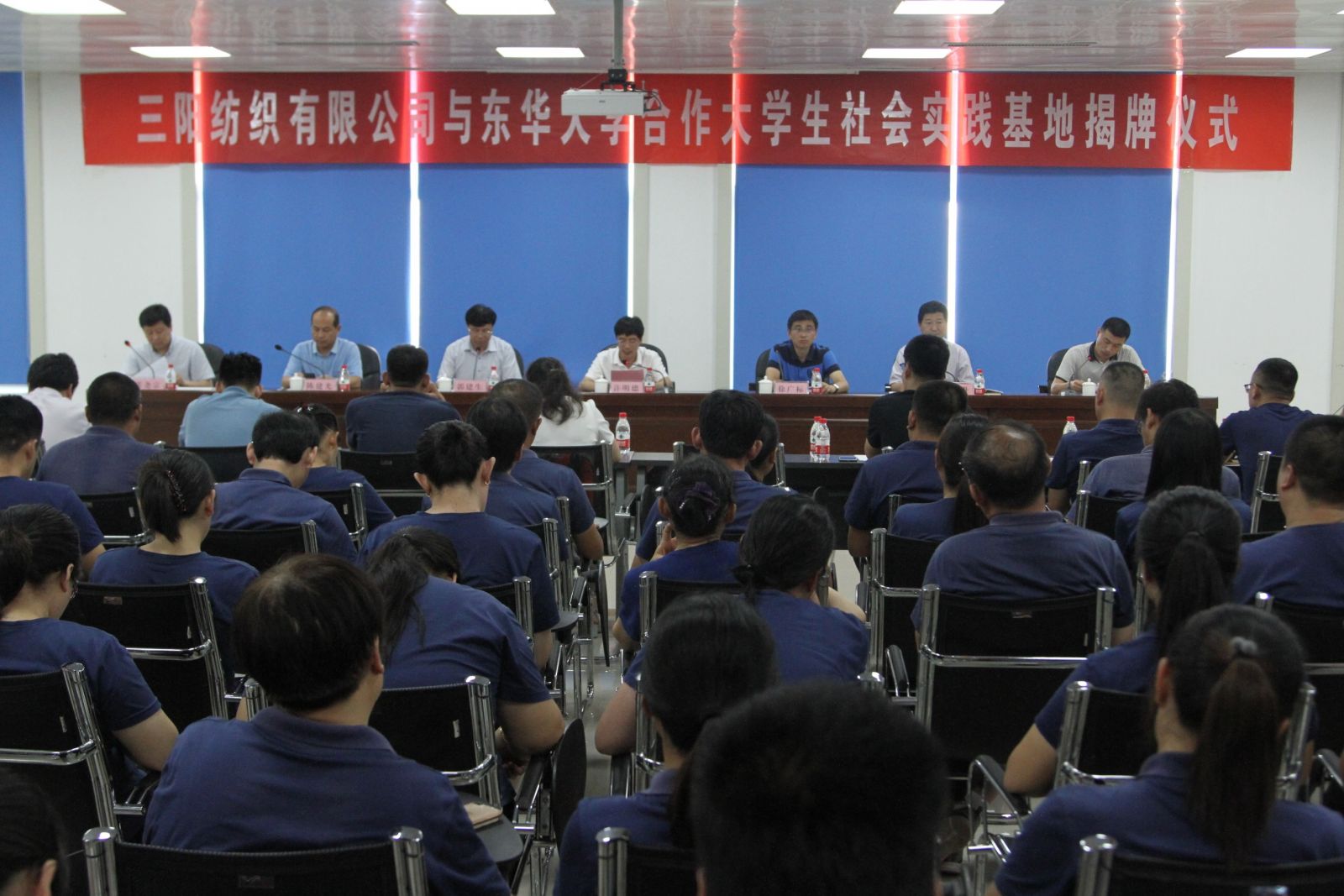 在热烈的掌声中,县委常委、组织部长许明德、东华大学纺织学院副院长徐广标、三阳公司董事长兼总经理张尧宗、东华大学纺织学院副院长郭建生共同为“研究生社会实践基地”和“本科生社会实践基地”揭牌。.jpg)