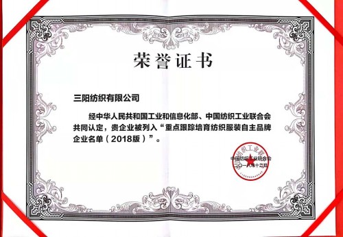 据中华人民共和国工业和信息化部与中国纺织工业联合会文件消息,三阳纺织有限公司被国家工信部和中纺联共同认定列入“重点跟踪培育纺织服装自主品牌企业名单(2018版)”。此次全国共有120家纺织服装品牌入选榜单,其中加工制造品牌仅40家企业入选。据悉,入围“重点跟踪培育纺织服装自主品牌”名单的企业,将被纳入国家工业和信息化部和中国纺织工业联合会的重点跟踪培育机制,跟踪掌握企业发展情况,同时能够为品牌企业发展营造良好市场环境,提高公共服务质量,支持品牌企业提高核心竞争力,促进形成具有较强市场影响力和国际竞争力的优势纺织服装品牌企业。