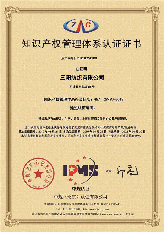 近日,三阳纺织有限公司圆满通过了知识产权管理体系贯标认证审核。
