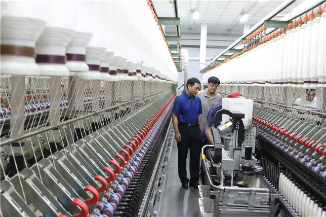 在公司办公楼二楼接待室,刘虎城副总经理汇报了企业发展情况及公司“现代优势产业集群+人工智能”工作推进情况。他说,随着信息技术的飞速发展,市场客户相应速度、客户服务等因素已同传统的质量、革新、功能化和成本列为企业竞争的必备要素,多年来,在县委县政府的正确领导下,三阳纺织有限公司管理层认真贯彻“科学技术是第一生产力”的重要思想,高度重视企业信息化管理进程,在公司内部全面贯彻落实集团实施信息化建设的重要工作部署,2016年,公司生产在线智能化系统建设项目成功上线,该项目的实施进一步完善了车间内部互联互通网络架构,提升了企业综合集成水平,实现了企业工艺、制造、管理等环节的集成优化,推进了公司在装备智能升级、工艺流程优化、精益生产、可视化管理、质量控制与追溯等方面的快速提升。公司在2017年上线的生产在线智能落纱系统,实现了落纱工序的全程自动化,成功弥补了公司用工难、用工成本增加方面的缺陷,同时在一定程度上降低了一线职工的劳动强度。2019年,我公司申报的“生产在线智能化系统建设项目”入围第一批150个“现代优势产业集群+人工智能”试点示范企业和项目。多年来,公司严格遵循集团“文化统领、制度保障、智能监管”的企业管理模式,积极推进企业技术进步,建立了良好的技术创新机制,“现代优势产业集群+人工智能”工作的推进将在企业质量变革、效率变革、动力变革过程中发挥重要作用,塑造高质量发展新优势,为企业发展注入新活力。