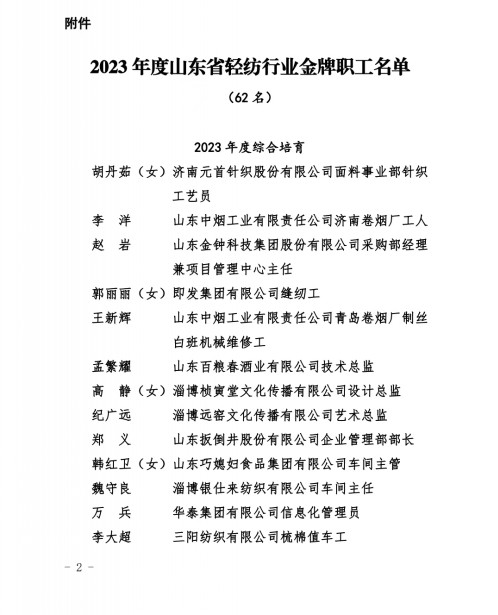 为深入学习宣传贯彻党的二十大精神, 贯彻落实习近平总书记关于工人阶级和工会工作的重要论述, 大力弘扬劳模精神、劳动精神、工匠精神, 激励全省轻纺行业广大职工争先创优、建功立业,省轻纺工会组织开展了 2023 年度山东省轻纺行业金牌职工培育工作。经过层层筛选,最后确定 62 名“2023 年度山东省轻纺行业金牌职工”。其中,我公司精纺三车间梳棉值车工李大超荣获“山东省轻纺行业金牌职工”荣誉称号。