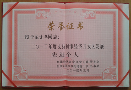 3月11日上午,由县经济开发区、凤凰城街道组织召开的2014年工作会议暨乡村文明建设提升年行动动员会议在县开发区12楼会议室举行。在会上公司荣获二〇一三年优秀企业荣誉称号,公司行政总监陈建华荣获二〇一三年度支持利津经济开发区发展先进个人荣誉称号。